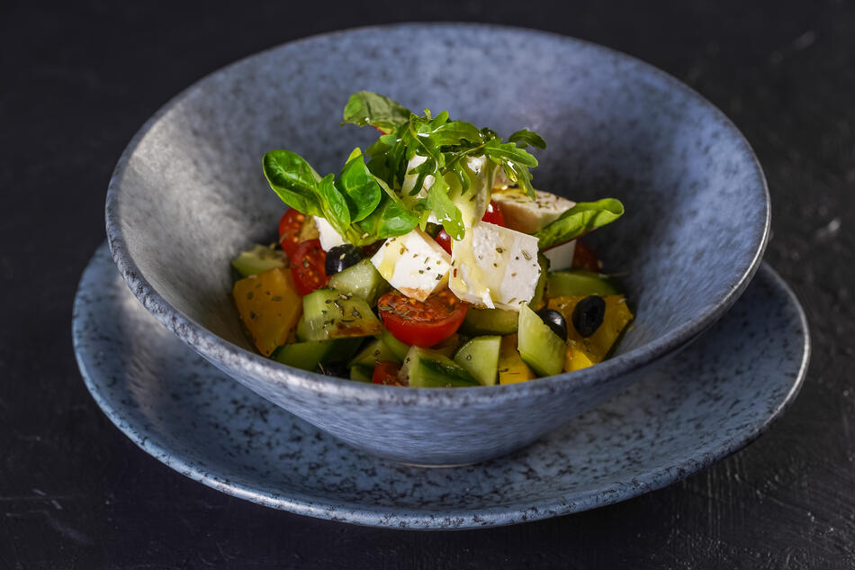Томаты черри, огурец свежий, перец болгарский, маслины, сыр фета, микс салата. Заправка из орегано, бальзамического уксуса, оливковым и зеленым маслом.