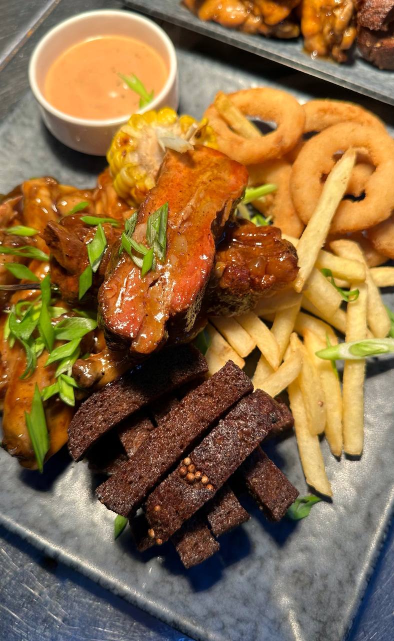рёбрышки пикантные, крылышки, колбаски, сырные палочки, наггетсы куриные, картофель фри, кетчуп, соус BBQ, сырный соус