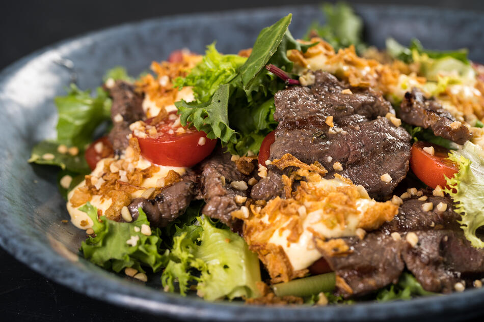 Микс салата, томаты черри, говяжью вырезка приготовленная на гриле, заправлен фирменным соусом «Проспект», подается с луком фри и дробленым арахисом.