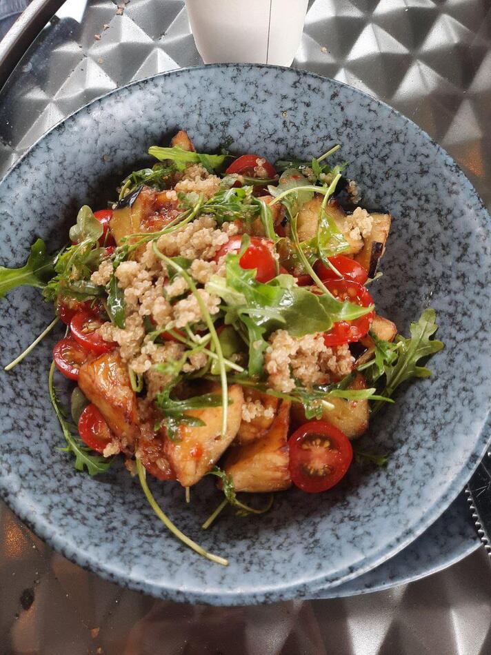 Салат из баклажана во фритюре с добавлением томатов, руколы, киноа и фирменного соуса